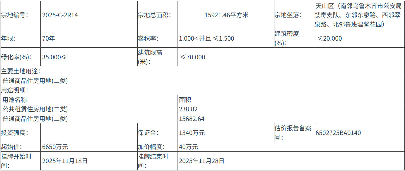 2025-C-2R14 號(hào)地塊:2025年11月18日 11時(shí)00分 至 2025年11月28日 16時(shí)00分;