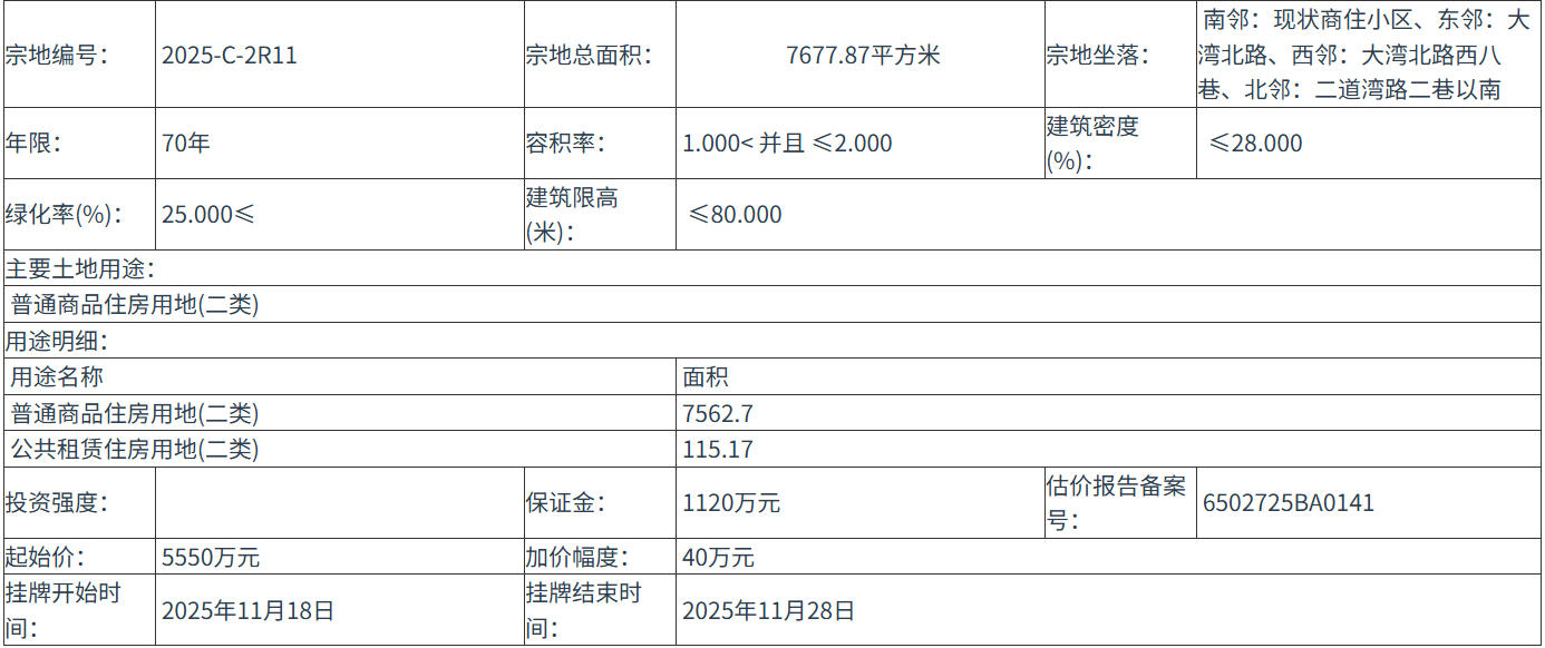 2025-C-2R11 號(hào)地塊:2025年11月18日 11時(shí)00分 至 2025年11月28日 16時(shí)00分;