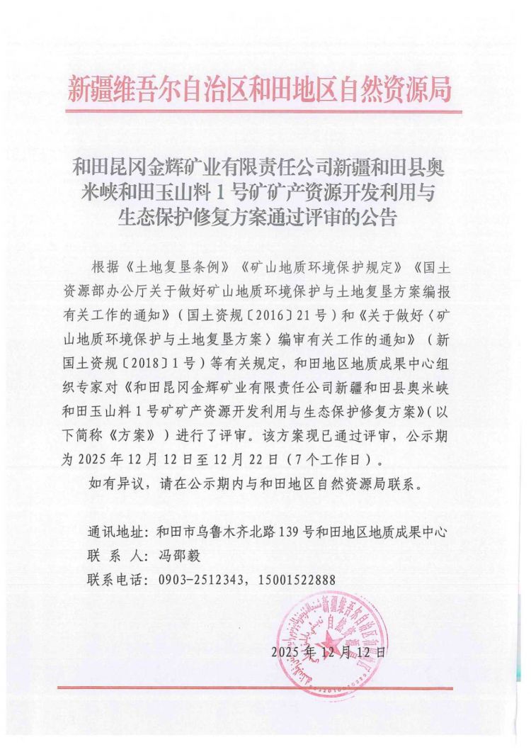 和田昆岡金輝礦業(yè)有限責(zé)任公司新疆和田縣奧米峽和田玉山料1號(hào)礦礦產(chǎn)資源開發(fā)利用與生態(tài)保護(hù)修復(fù)方案通過評(píng)審的公告