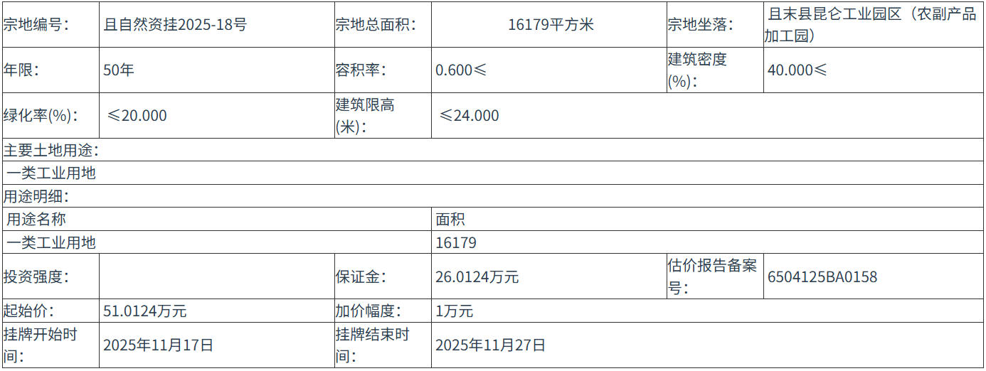 四、 本次掛牌出讓的詳細資料和具體要求,見掛牌出讓文件。申請人可于 2025年10月28日 至 2025年11月16日 到 巴州政務(wù)服務(wù)和公共資源交易中心(庫爾勒市索克巴格路巴州住建大廈11樓1118室) 獲取 掛牌出讓 文件。